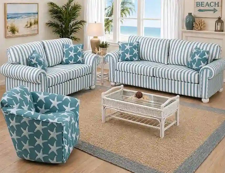Includes plush, fiber filled back reversible “T” back cushions and high density dacron wrapped seat cushions. 20” welted throw pillows included.